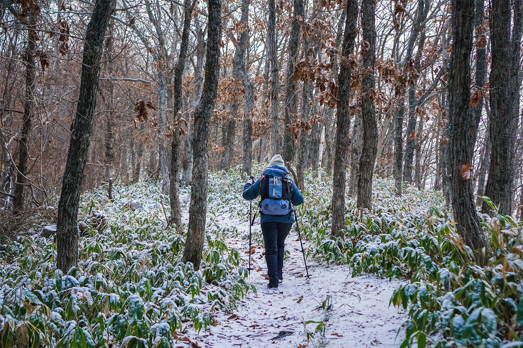 Depending on snow depth, we will either use crampons or snowshoes, or both. A backpack is needed to carry your snowshoes until we put them on.